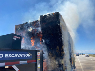 At Manilla and I-70 at 1:50 pm on Saturday, July 30th, our trailer caught on fire hauling two months of hay to feed for our rescue animals as we headed home from the hay auction. The investigators ruled it 'spontaneous combustion'; all hay and our trailer are a complete loss.